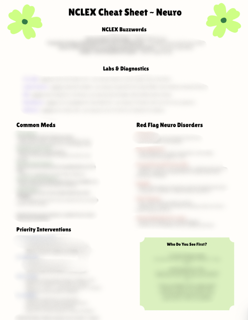 Made by a new grad nurse who just went through it! Includes: High-yield breakdowns, red flags, buzzwords, meds, labs, interventions, & prioritization triggers.